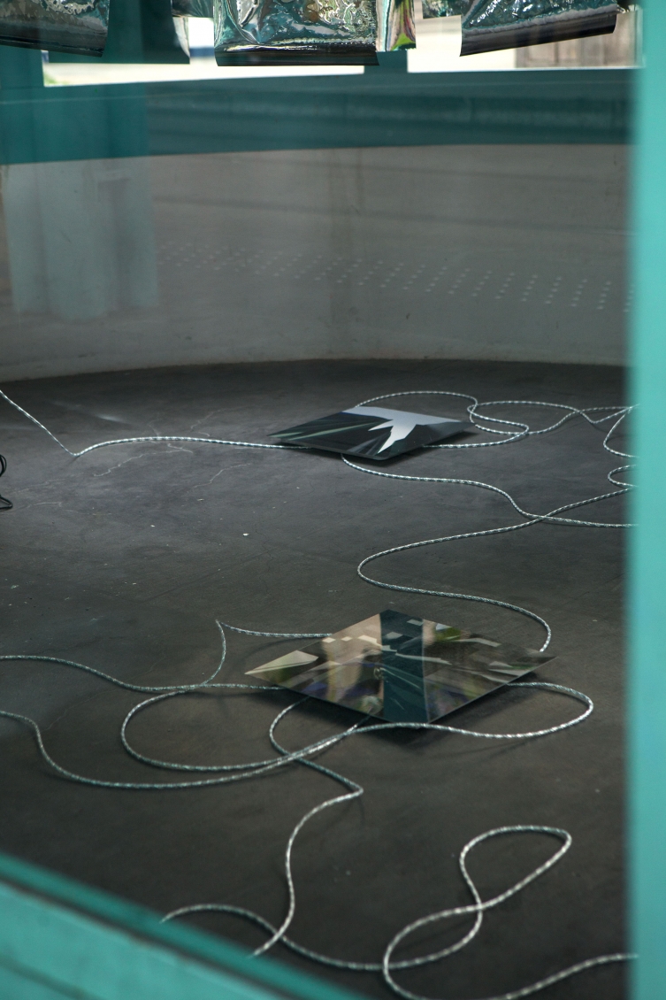 In opposition to the cloud of flags Langschied places a messy network of cables on the floor which connects two central towers with a series of aluminum prints that function as portals into a digital reality. The glitched images indicate that this digital reality is generally way more chaotic than the titans of the internet want to make us to believe.