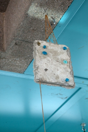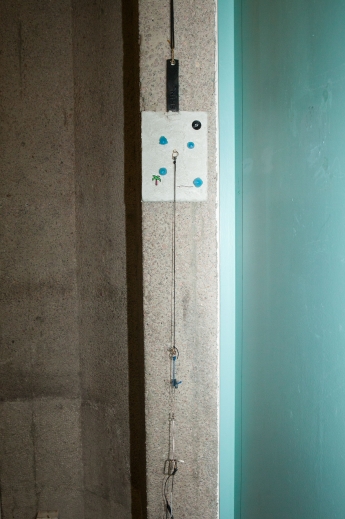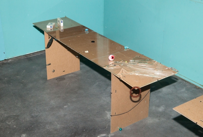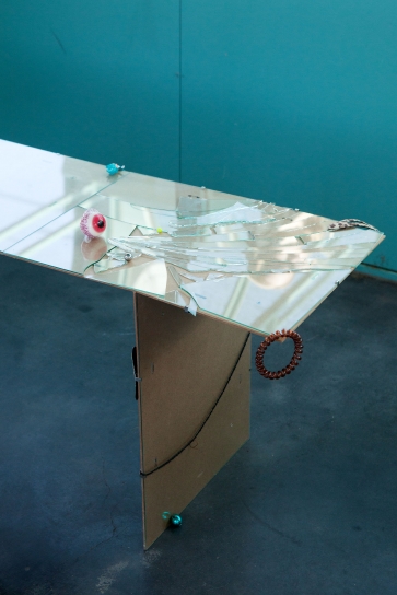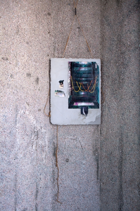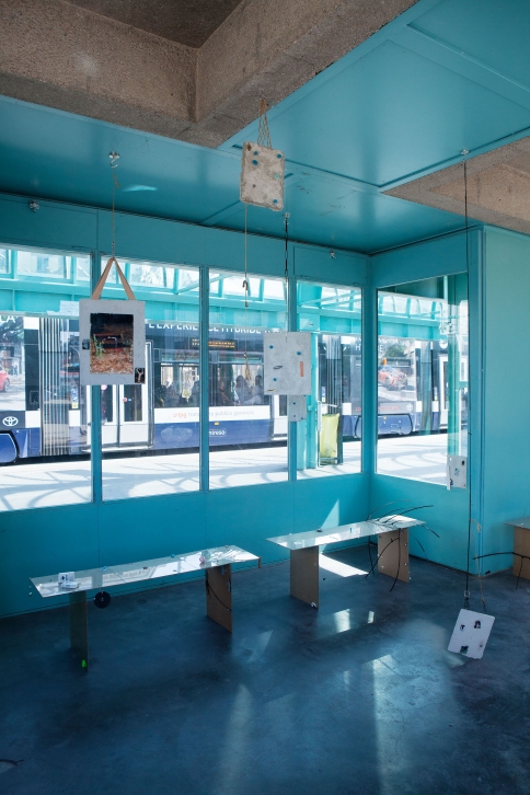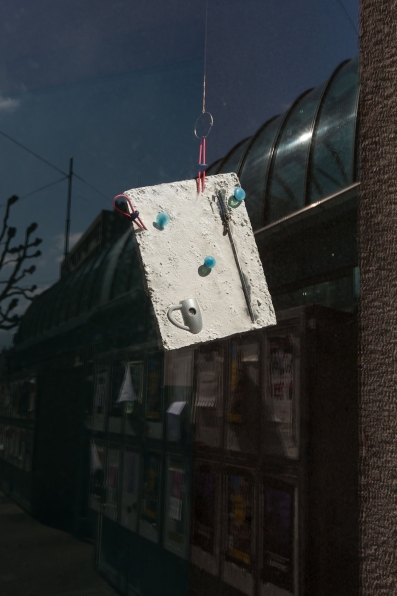 The linear metal vaults, each with a small semicircular room attached, run parallel to the tram platform. They are positioned in such a way that we can circulate fluidly around them. The building envelope of sandblasted concrete and curved glass panes separates the public space from the art space. The porosity of the material provides a base for adhesion, and in the glass one recognises its distorted image. The objects exhibited inside become part of the space. The glass panes of the picture frames, which are placed along the walls in the form of a bench, reflect the immediate environment. The concrete slabs, charged with artefacts of public space, blur with the walls. Detached from the context, I see in these found objects mass-produced items that have been casually consumed and later discarded. Things that are hardly missed, that are almost made to be lost. Souvenirs of a controlled consumer behaviour. The bench as a symbol of designed public space seems very fragile, probably not usable as such. This furniture that tells you, here you have to wait, here you have to meet and stay, here you have to enjoy the view.