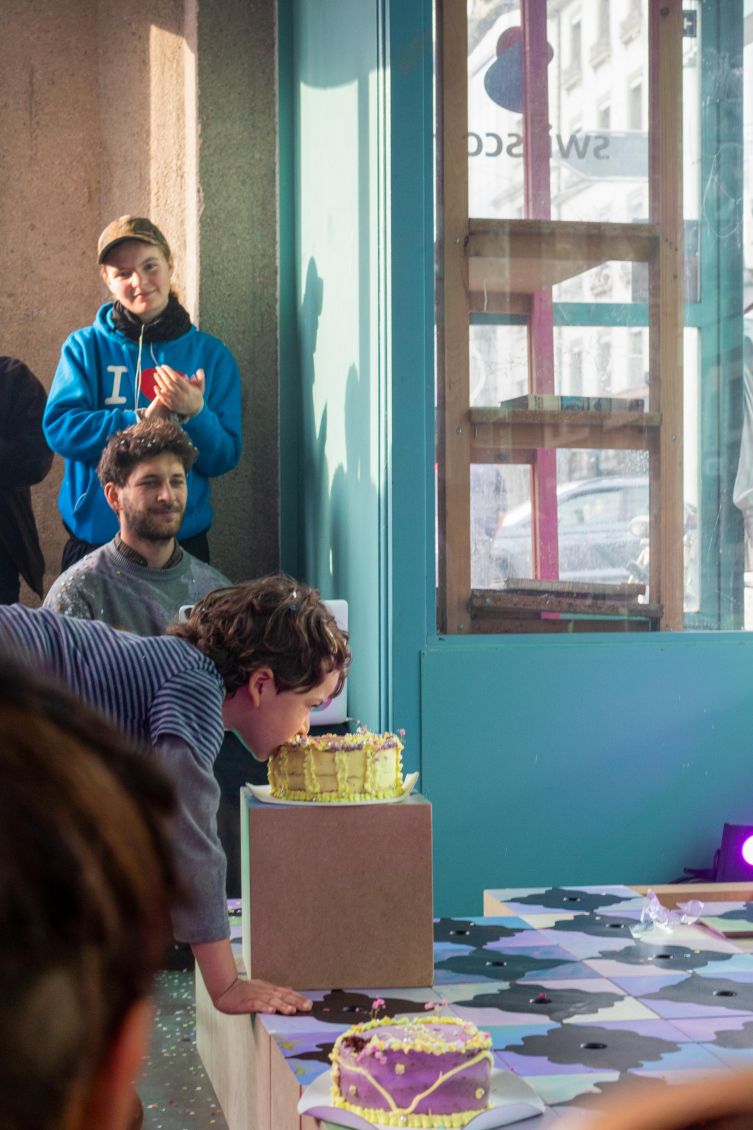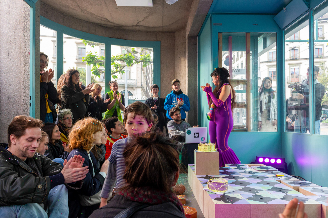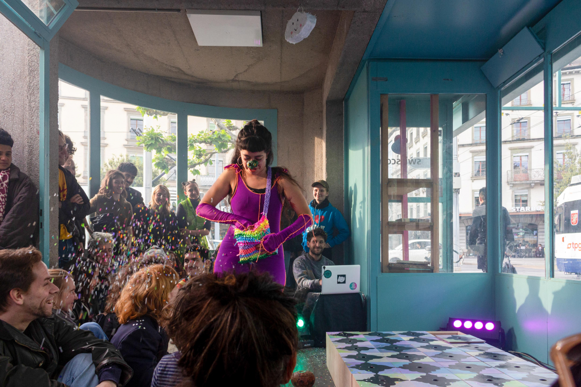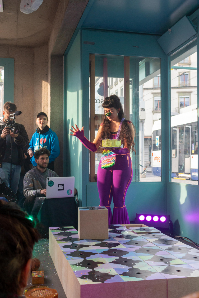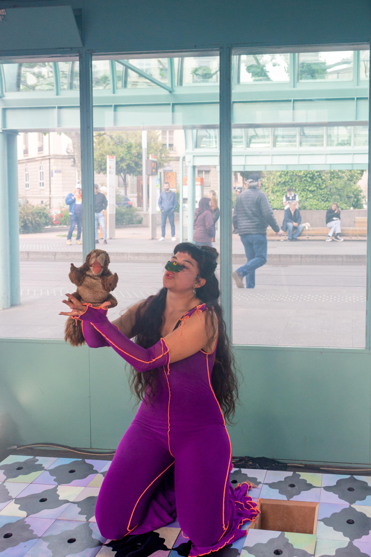 Cette multitude de réceptacles donne lieu à un spectacle. Lors du vernissage, Maria Fernanda propose une performance dans laquelle elle incarne un clown. Mais pas celui qu’on a pour habitude de voir. Celui-ci vient du Sud, de l’autre côté de l’océan Atlantique. Il vacille sur ce sol surélevé de l’espace de Zabriskie. Il est ridiculisé, mais raconte pourtant la vérité. Par ses trébuchements, il symbolise la démarche instable des migrantexs, qui vacillent et se rattrapent de justesse. Cette instabilité renvoie à la difficulté des chemins de la migration, à ces moments de pertes de repères et de sentiment d’appartenance. Le sol dallé symbolise à la fois cette précarité et cette violence, mais aussi la réconciliation avec le passé et le présent. La précarité devient ici ressource.