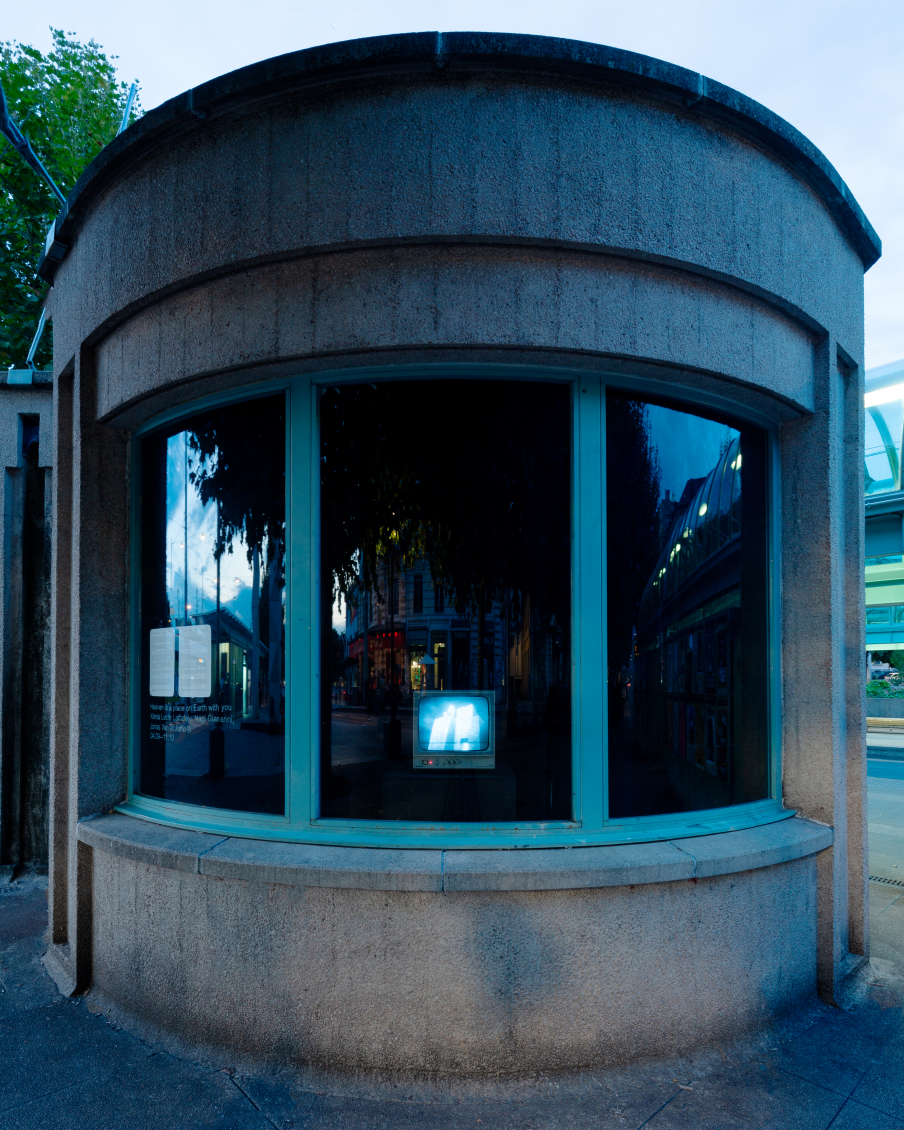Au seuil du monde extérieur, Xénia Lucie Laffely imagine un rêve cauchemardesque dans une bannière suspendue au-dessus de la porte. La vision fugace dépeinte à travers son oeuvre « Pigeon Fish » est tiré d'un monde aux couleurs charnues, soumis à des relations inter-espèces - le maillage translucide d'une réalité répartie d'amants humains, de pigeons hantant les balcons et de poissons rôdant à l'abri aquatique. Leurs corps s'entremêlent, leurs visages cousus et égouttés se rattachent au tissu, dévoilant de nouvelles possibilités d'assemblage et de fusion dans un avenir hybride.