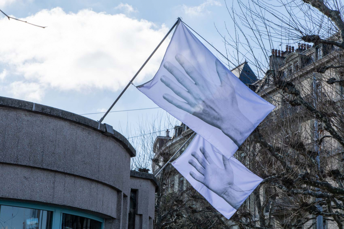 Jan-Pieter est le troisième artiste de la chaîne d’invitation, il vit et travaille à Amsterdam et a été invité par Andrea Salerno. Jan-Pieter a choisit de travailler sur la représentation photographique d’une main ouverte, qu’il nous montre vue de l’intérieur sur un drapeau, puis de l’extérieur sur le deuxième. Grâce aux deux faces de chaque drapeaux, la photographie d’une main se transforme en une séquence spatiale de quatre images qui semblent interagir les unes avec les autres à la guise des intempéries.
