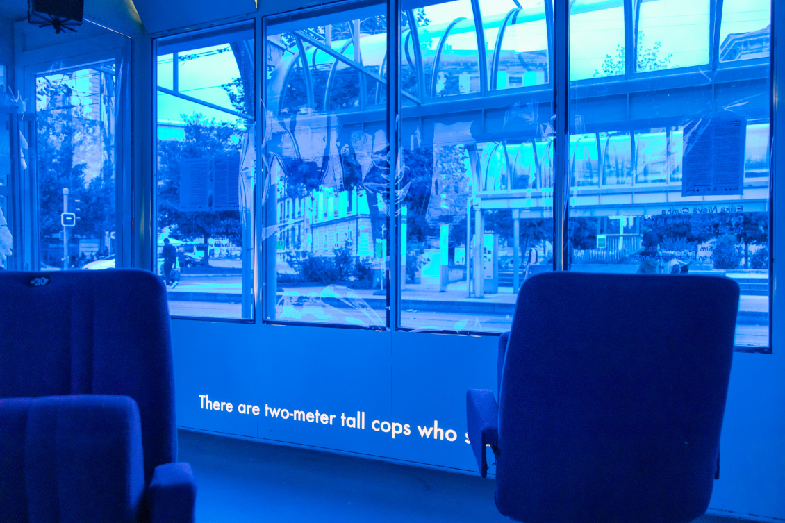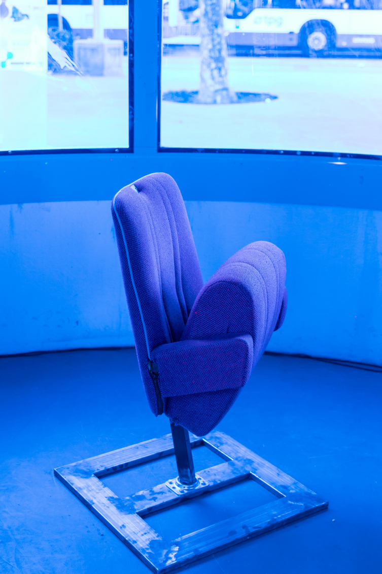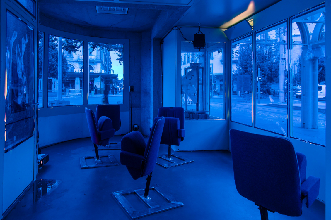 Des yeux derrière la tête s’est d’abord déployée sous la forme d’une installation immersive : six sièges rotatifs dans une salle enveloppée d’un bleu profond, presque obscur, un bleu pensé comme un refuge, mais aussi comme celui des « nuits américaines », ce subterfuge cinématographique qui transforme le jour en nuit. En sortant, le jour éclate au visage, trop vif, presque rouge, rappel brutal de ce que l’on préfère ignorer.