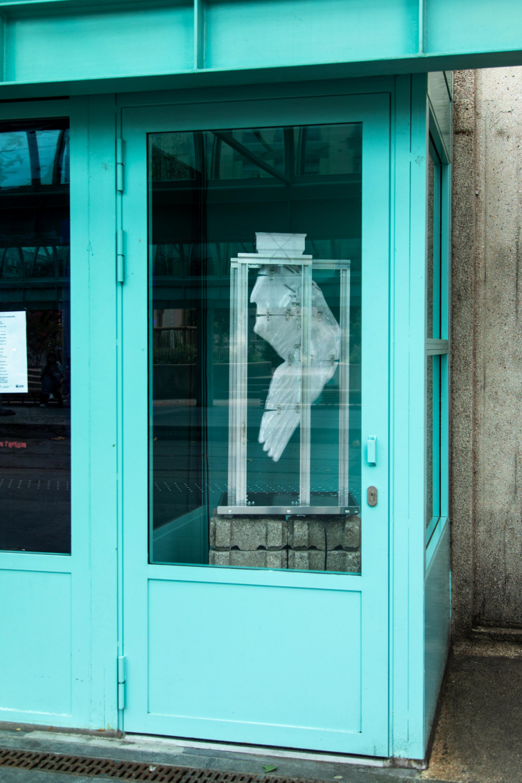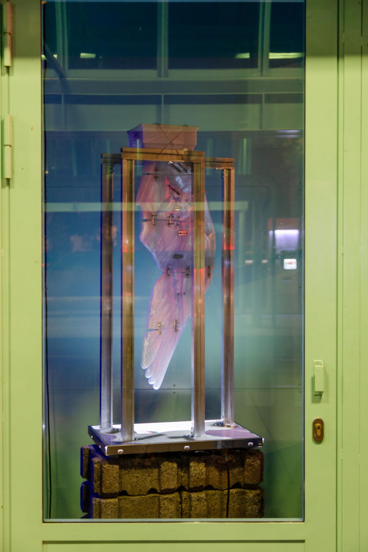 Big Chunk, qui occupe la première cabine, repose sur un socle en béton ; un écran d’ordinateur abîmé est posé sur son sommet et accueille une structure en aluminium à laquelle une aile de cygne raftistolée, comme une aile d’ange suspendue dans un équilibre précaire. Une interface informatique fictive, défaillante et presque sarcastique, nous promet une connexion vers un monde plus clair, plus rapide… mais toujours, un futur hors d’atteinte.