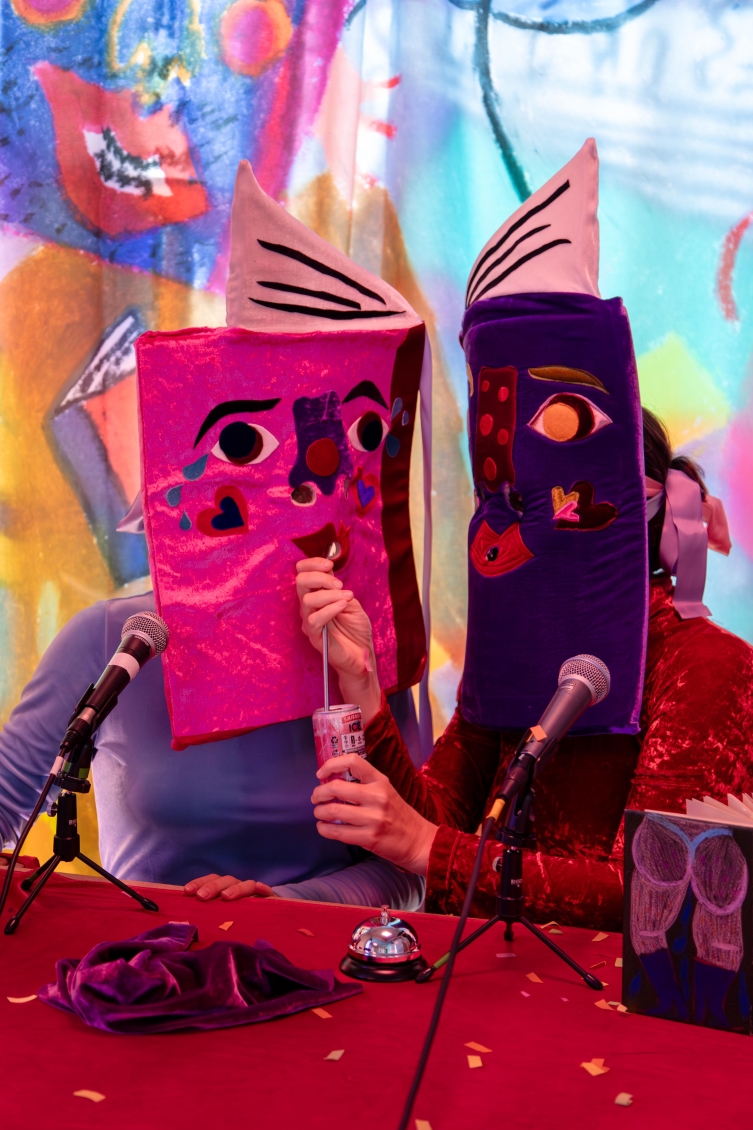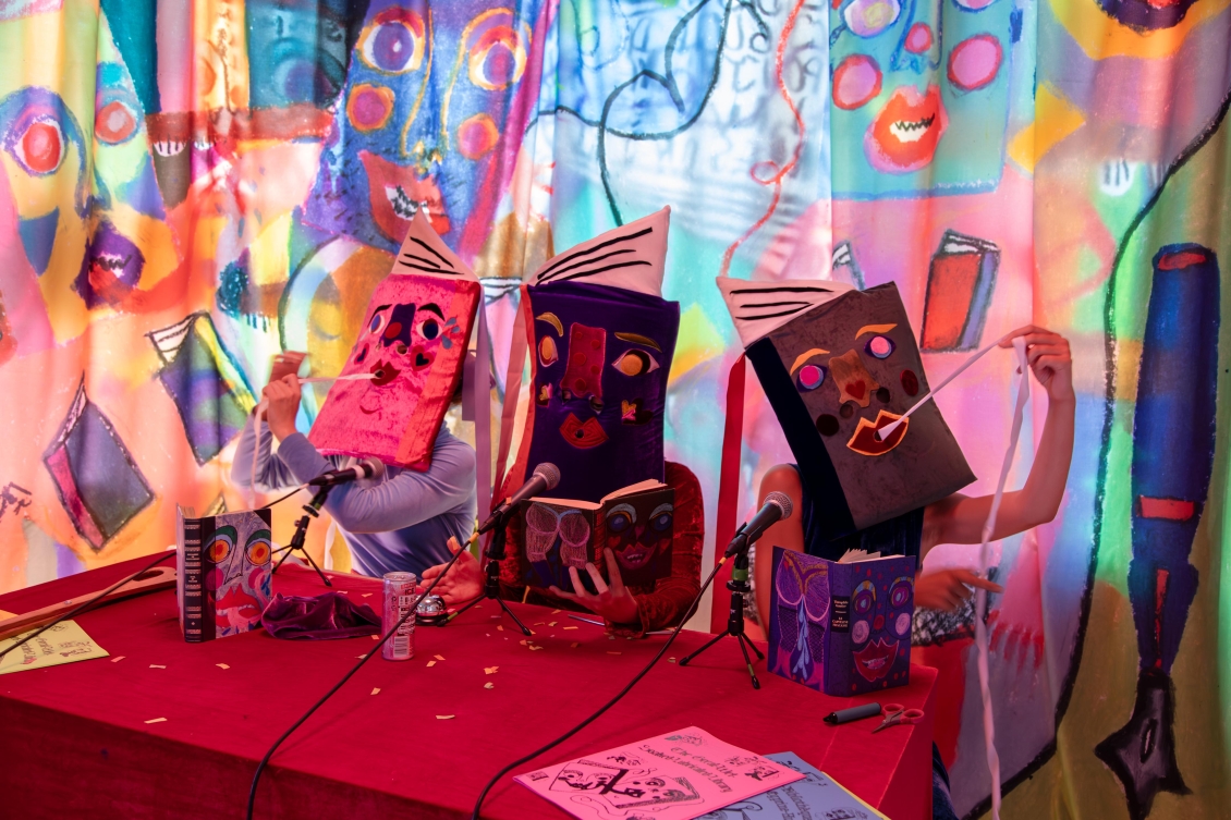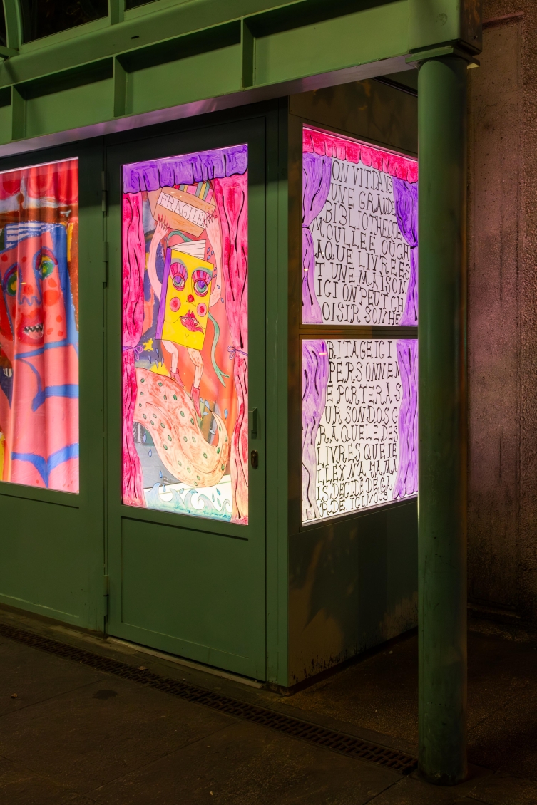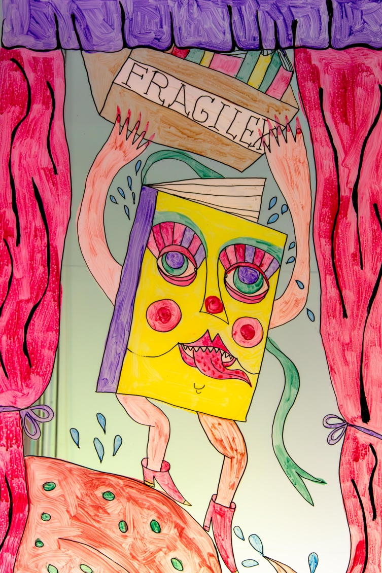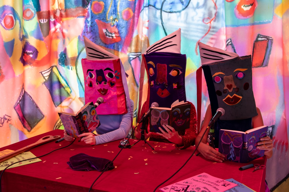 Elle met en scène trois personnagexs-livres dans un univers ruisselant et coloré. Ensemble, iellexs racontent la moite histoire d’une communauté de livre formant une bibliothèque très très très trempée; “La Grande Bibliothèque Mouillée À La Cyprine Humide”.