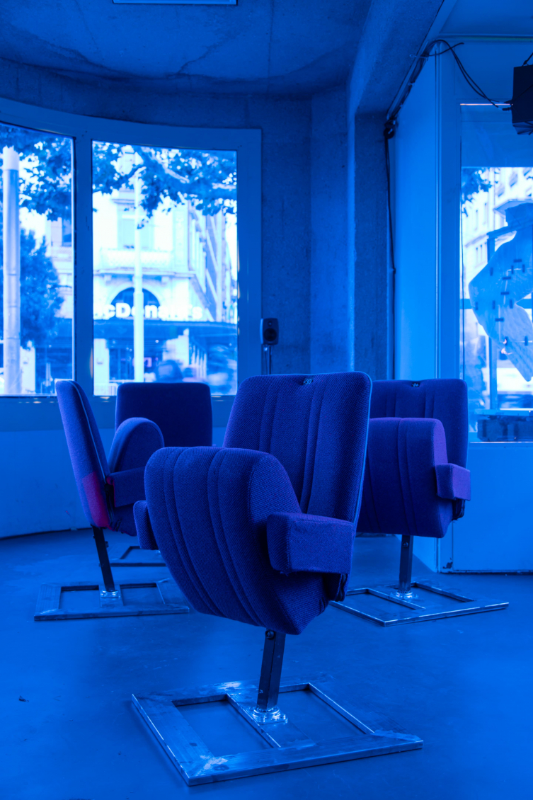Des yeux derrière la tête s’est d’abord déployée sous la forme d’une installation immersive : six sièges rotatifs dans une salle enveloppée d’un bleu profond, presque obscur, un bleu pensé comme un refuge, mais aussi comme celui des « nuits américaines », ce subterfuge cinématographique qui transforme le jour en nuit. En sortant, le jour éclate au visage, trop vif, presque rouge, rappel brutal de ce que l’on préfère ignorer.