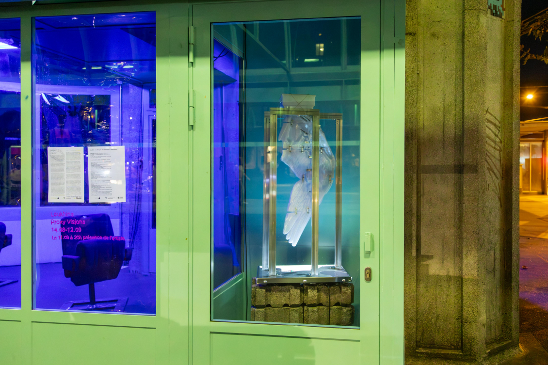 Pour la première fois investies par l’espace d’art Zabriskie Point, les deux anciennes cabines téléphoniques situées à l’arrêt du tram du rond-point de Plainpalais deviennent l’écrin idéal pour accueillir Proxy Visions, une installation issue du projet de diplôme de Loukhine (Kirill Tscheluchin), A Synthetic Chimera Caressed by Proxy Visions, saluée par les félicitations du jury du Bachelor en arts visuels de la HEAD Genève.