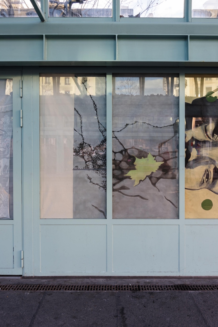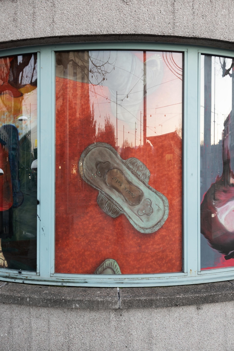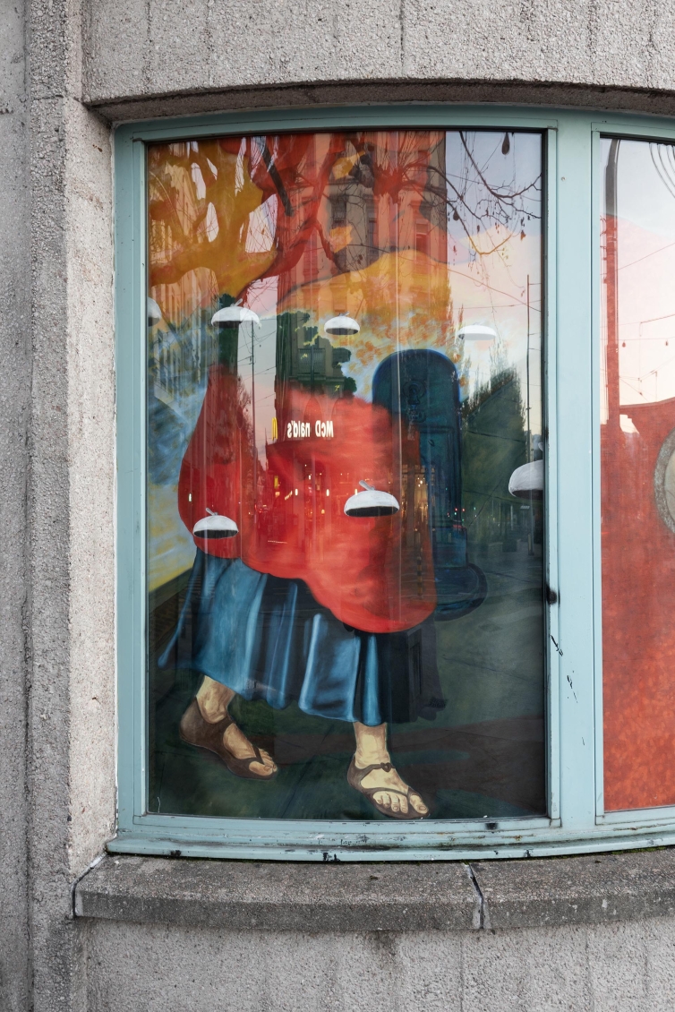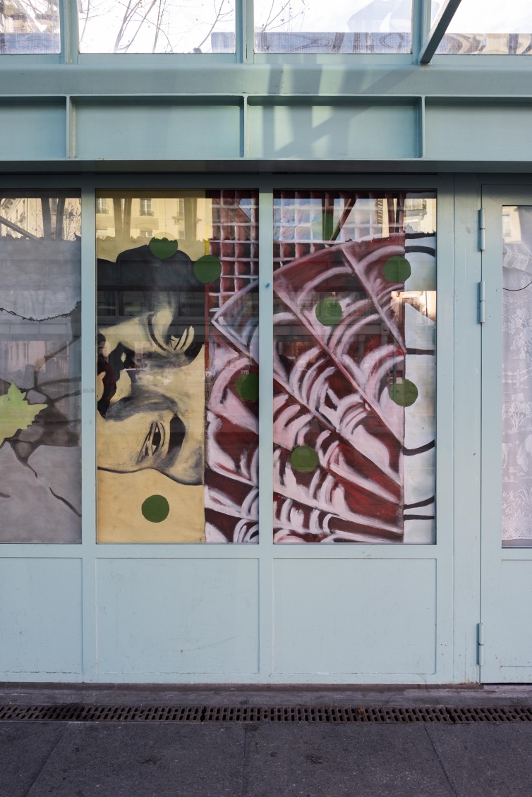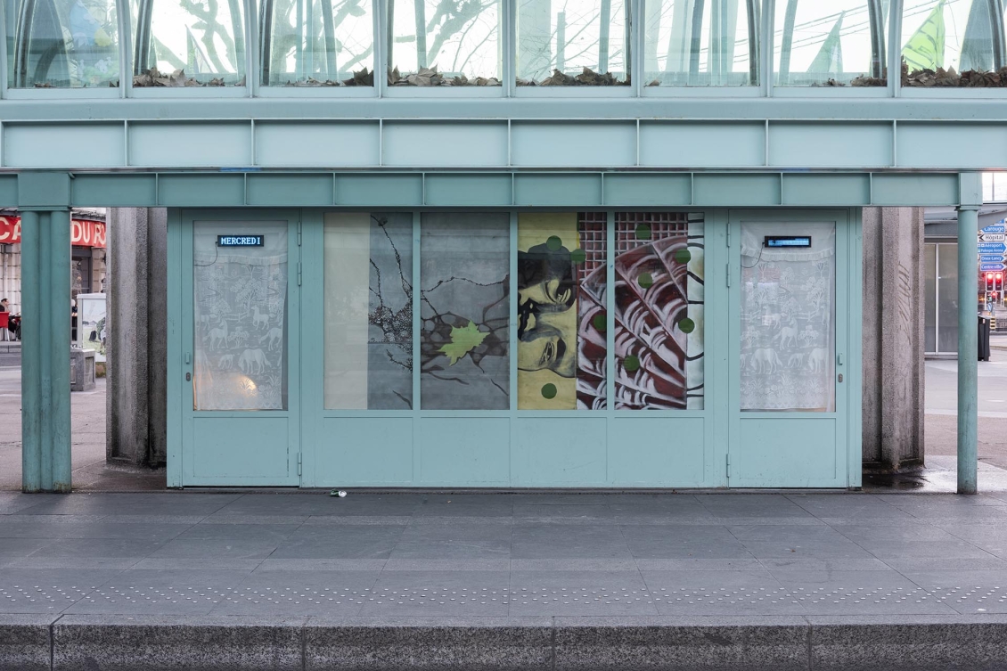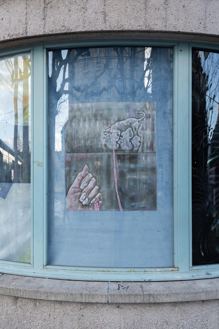 Pour cette édition des Rideaux, nous avons choisi d’inviter 9 peintres, basé·e·s ou possédant un lien fort avec Genève. Les artistes convié·e·x·s ont comme autre point commun un style pictural figuratif, qui interroge à la fois sa place — aujourd’hui en plein regain dans l’art contemporain — et sa présence dans l’espace public. Chaque artiste s’occupe d’une fenêtre de l’ancienne salle d’attente. Iels s’approprient leur pan de tissu, choisi personnellement, avant que les diverses peintures ne soient assemblées pour prendre l'apparence d'un rideau unique depuis l’extérieur de l’espace. Ce geste nous permet d’aborder la peinture d’une manière différente dans un lieu qui, par son architecture, n’est pas le plus évident pour accueillir ce médium. Ici, la peinture se déploie autrement: en fragments, partagée, en dialogue direct avec le tissu urbain, comme un cadavre-exquis.