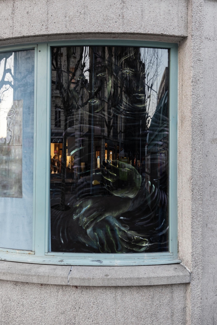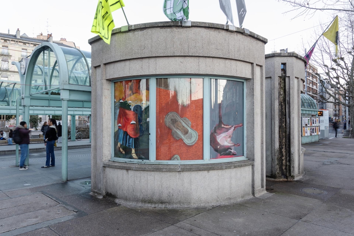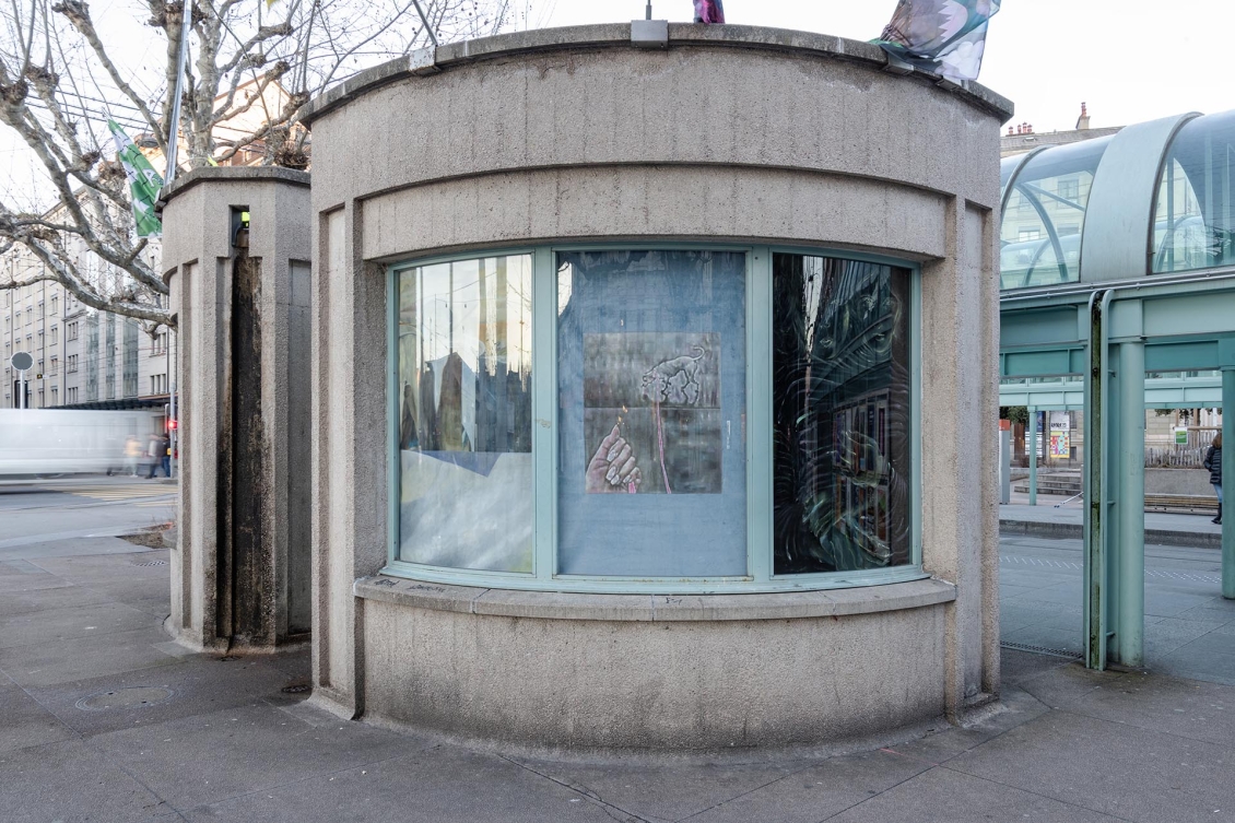 Les artistes prennent pour point de départ ce qui fait l’identité du quartier: les statues de bronze Alter Ego de Gérald Ducimetière qui encerclent Zabriskie, les passant·e·x·s qui attendent le tram ou pressent le pas, un chien promené au bout d’une laisse, les feuilles mortes qui emportées au gré du vent, les affiches publicitaires placardées partout ou encore les rats qui traversent furtivement la plaine de Plainpalais. Chaque peinture, chaque fragment du rideau, est pensé comme un reflet ou une trace de ce contexte, et une fois réunis, ils forment une image collective, hétérogène et multiple, en écho à l’espace urbain.