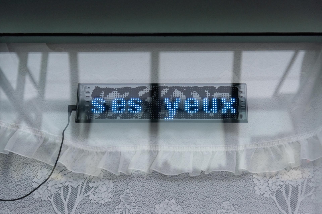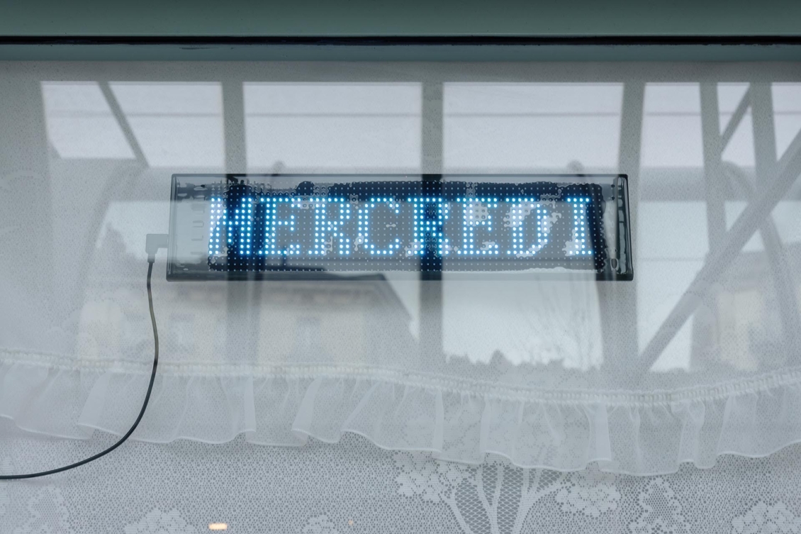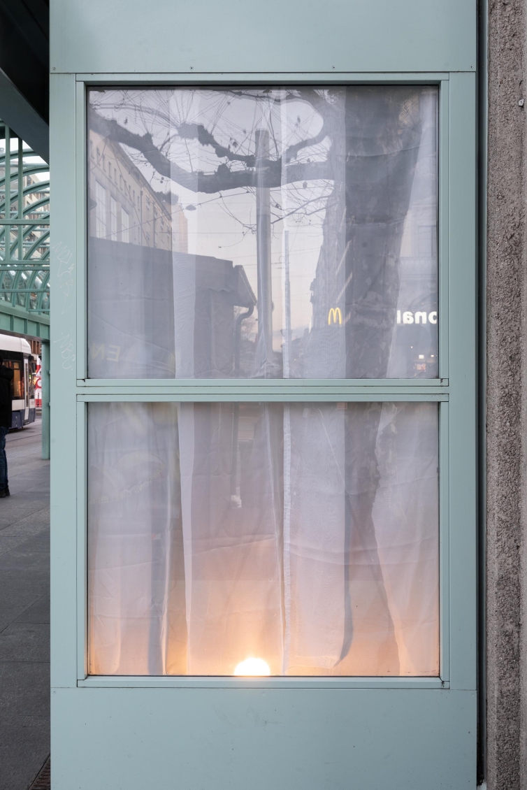 Chaque début d’année, Zabriskie confie à un·x·e artiste la réalisation d’un rideau qui vient habiller les fenêtres du lieu depuis l’intérieur de l’espace. Utilisé au fil des expositions et entre les montages, ce rideau offre un certain confort d’intimité aux artistes tout en devenant un élément familier du rond-point de Plainpalais.